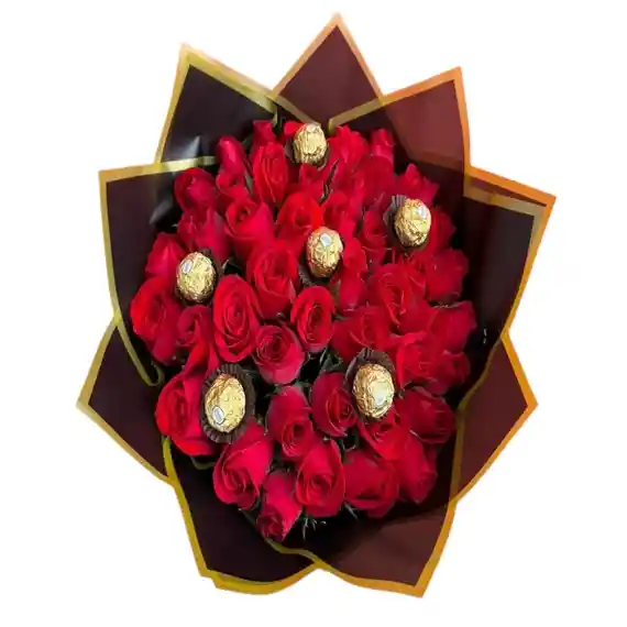 RAMO DE 50 ROSAS, 6 CHOCOLATES FERREROO ROCHER, DECORADO EN PAPEL COREANO