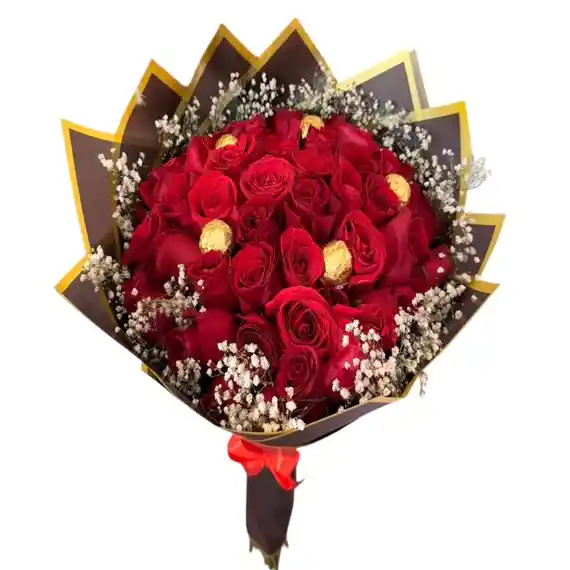 RAMILLETE DE 50 ROSAS, 5 CHOCOLATES FERRERO ROCHER, GHYPSFILIA, DECORADO EN PAPEL COREANO, LAZO EN CINTA