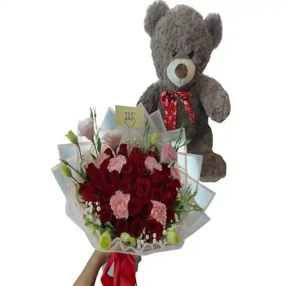 RAMILLETE DE 30 ROSAS, CLAVELES, FOLLAJE, PELUCHE PEQUEÑO, DECORADO EN PAPEL COREANO, LAZO EN CINTA.