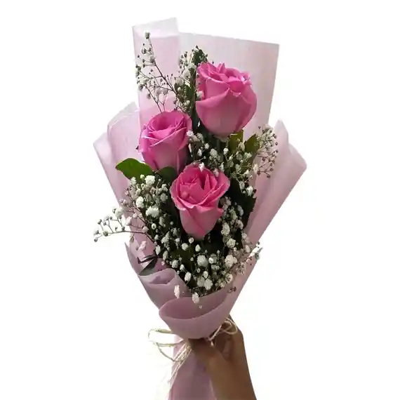 RAMILLETE DE ROSAS ROSADAS, FOLLAJE, DECORADO EN PAPEL COREANO, LAZO EN CINTA