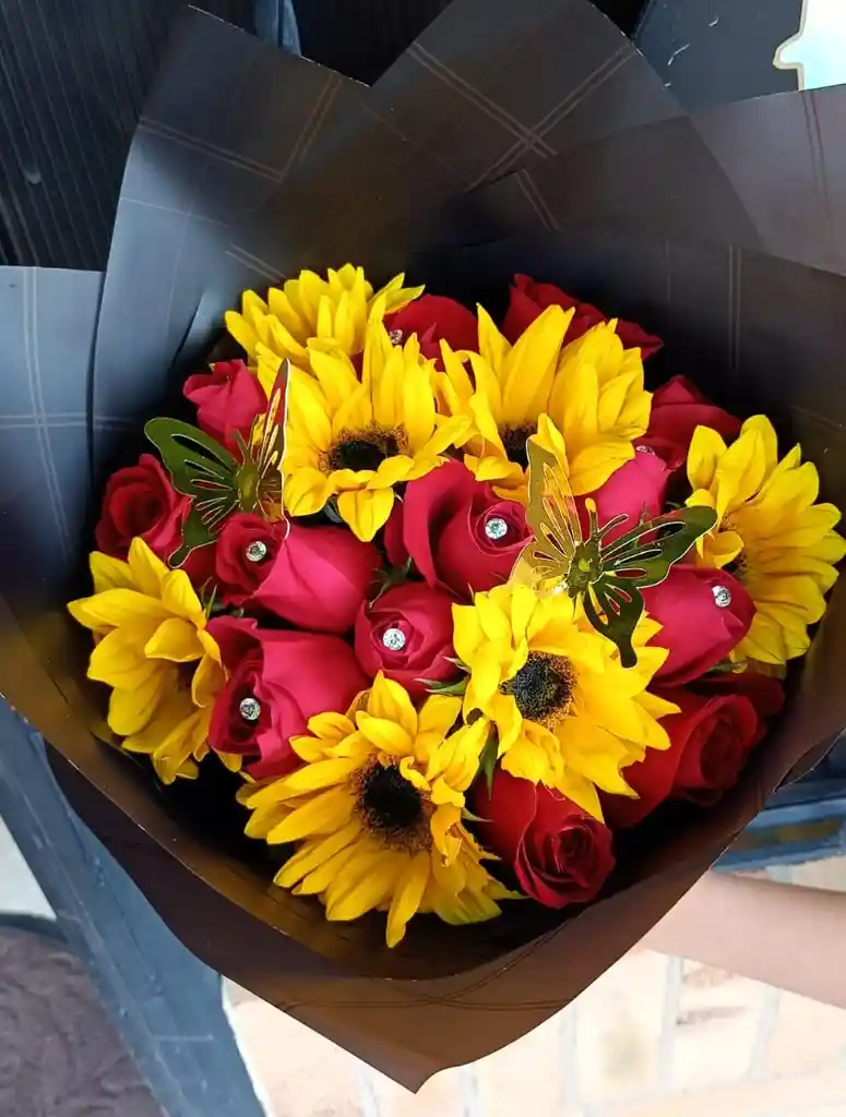 ramo 24 rosas y mini girasoles