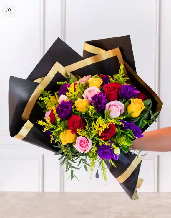 Un ramo vibrante que enciende los sentidos. Rosa roja, amarilla y clarita se entrelazan con delicados lisianthus para formar una mezcla intensa, alegre y ligeramente nostálgica, como el primer sorbo de una buena historia. Perfecto para regalar pasión, alegría y cariño en un solo gesto.