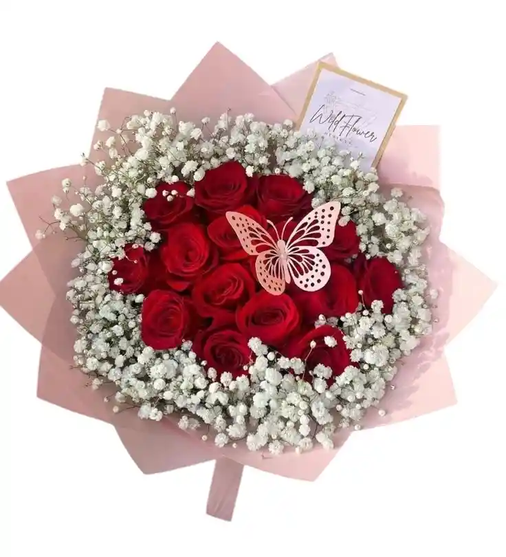 Cautiva con este diseño romántico y detallado, perfecto para expresar sentimientos profundos con un toque de fantasía. Este ramo presenta una selección de rosas rojas premium intensas, rodeadas por una delicada corona de Baby's Breath (nube) blanca que aporta volumen y textura etérea. El toque especial lo da una mariposa decorativa en tono rosa, convirtiendo este arreglo en una pieza artística.