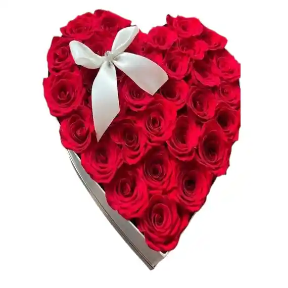 BASE EN FORMA DE CORAZON, ROSAS ROJAS, FOLLAJE, LAZO EN CINTA