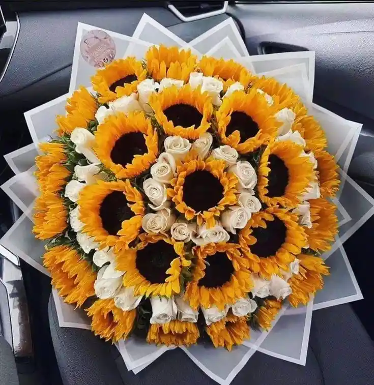 Ramo buchón de 24 girasoles y 40 rosas blancas Nota: La flor puede ser sustituida dependiendo la disponibilidad de color y del producto “Mensaje Personalizado” máximo de 30 caracteres (Dejar el mensaje en el chat, los comentarios no se previsualizan para la tienda por lo que si se dejan allí no podrá ser incluido).