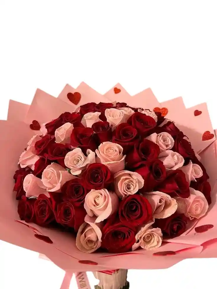 Sorprende a esa persona especial con este espectacular y voluminoso ramo de rosas premium, diseñado para transmitir amor y admiración en su máxima expresión. Esta composición combina la intensidad pasional de las rosas rojas con la delicadeza de las rosas rosa pastel, resaltadas con un sutil acabado de glitter que aporta un brillo mágico y exclusivo.