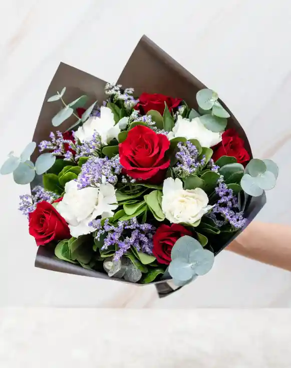 Hemos unido la flor más romántica en su color más pasional con la elegancia y el contraste de los tonos blancos. El resultado? El ramo Romantic Roses con rosa rojas sofisticadas al que es difícil resistirse. -Flores que contiene: Rosas Roja, Clavel Blanco, Limonium, Clavo Japonés, Dólar.