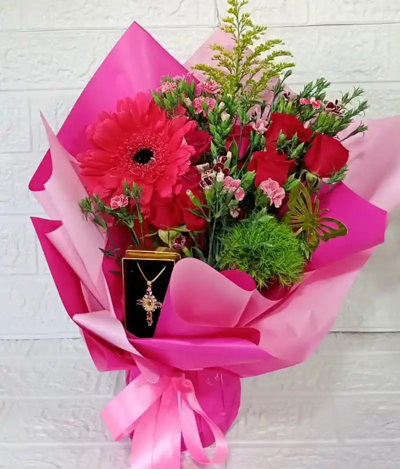 RAMO CON COLLAR Y DIJE DE FANTASIA CON GERBERA Y MINI ROSAS. LAS TERCERA FOTO SON LAS OPCIONES DISPONIBLE. POR FAVOR ESCRIBIR POR EL CHAT