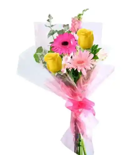 Ramo de 2 rosas amarillas y 2 gerberas (color sujeto a disponibilidad del día) en bouquet con follaje, papel y moño