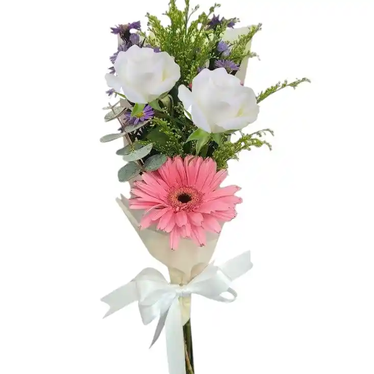 Ramo de 2 rosas blancas y una gerbera, en bouquet con follaje, papel y moño