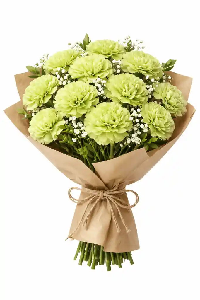 Un ramo moderno y vibrante compuesto por hermosos claveles en tono verde manzana, acompañados de delicados follajes que resaltan su frescura y originalidad. Su color transmite esperanza, renovación y energía positiva, convirtiéndolo en un detalle diferente y lleno de estilo. ✨ Perfecto para cumpleaños, celebraciones especiales o para sorprender con un regalo único y fuera de lo tradicional. 📌 Imagen referencial: El producto entregado conserva el mismo estilo, diseño y sentido del arreglo mostrado. El empaque o algunos complementos pueden variar según disponibilidad, manteniendo siempre la frescura, calidad y armonía del ramo. 🌿 Elaborado con flores frescas y preparado con dedicación para garantizar una excelente presentación.