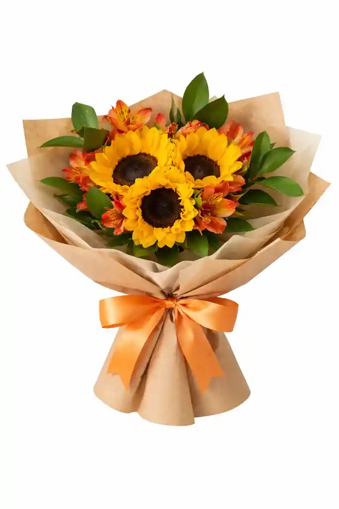 Un ramo vibrante y lleno de energía 🧡 que combina la intensidad de los girasoles con delicados toques en tonos naranjas y verdes. Su diseño cálido y natural, junto con su empaque rústico y lazo en tono naranja, lo convierten en el regalo perfecto para transmitir alegría, fuerza y amor