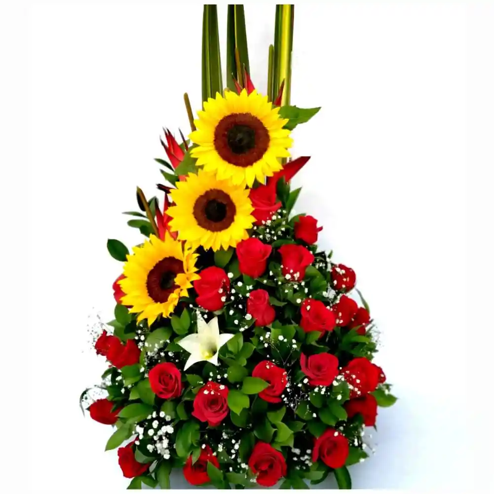 DESCRIPCIÓN Arreglo con girasoles y rosas rojas: combinación alegre y elegante, ideal para expresar amor o felicitaciones.” contiene 3 girasoles + 30 rosas rojas + gypsophila y follaje ETIQUETAS DE BUSQUEDA Arreglo floral Ramo de flores Bouquet de flores Buquet de flores Engalanado Ramillete de flores ramo de girasoles