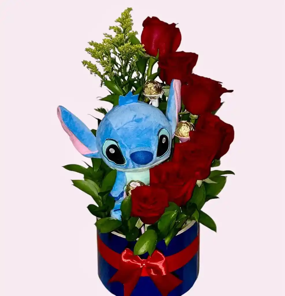 CONTIENE Arreglo floral con peluche Stich ,8 rosas rojas, 3 chocolates y follaje ETIQUETAS DE BUSQUEDA Ramo de flores Ramo de rosas Bouquet de flores Bouquet de rosas Arreglo floral