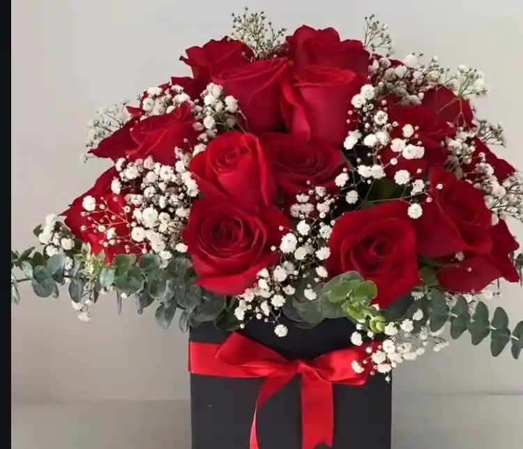 DESCRIPCIÓN Arreglo clásico y elegante: 24 rosas rojas frescas combinadas con gypso blanco y follaje, en caja negra con lazo rojo satinado. Perfecto para un gesto romántico o formal. ETIQUETAS Ramo de flores Caja de rosas Ramo de rosas rojas Arreglo Floral cilindro de rosas