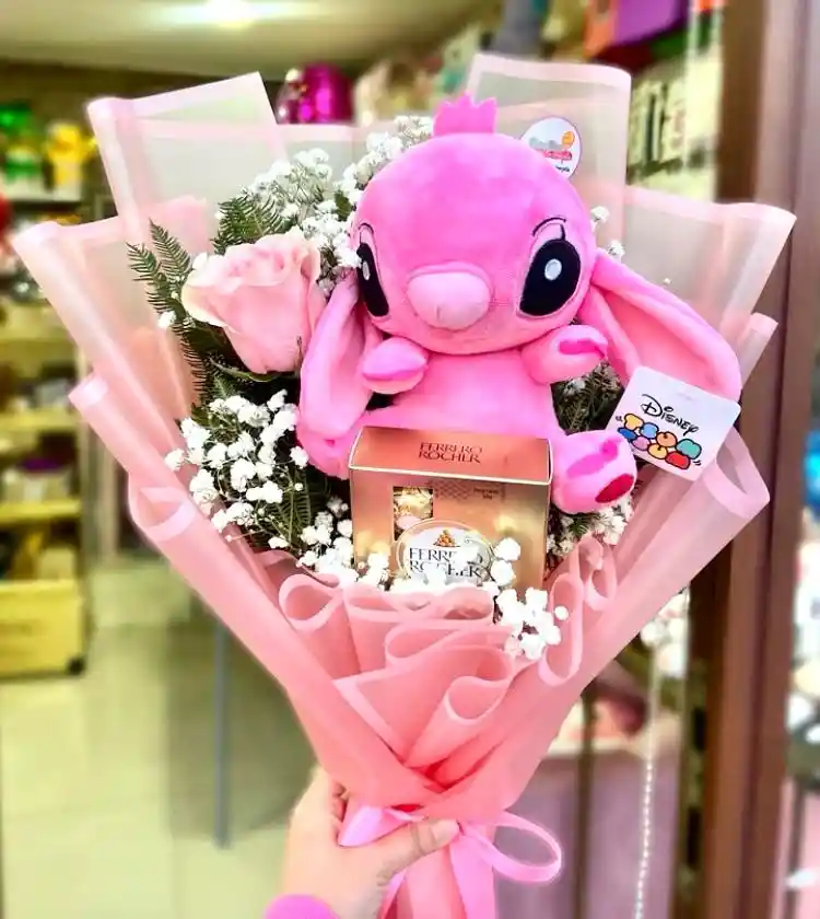 DESCRIPCIÓN Dulzura en cada detalle: bouquet con rosas rosadas, Follaje, peluche Angel, chocolates Ferrero Rocher y envoltura rosada de lujo. Ideal para cumpleaños, aniversarios o San Valentín ETIQUETAS DE BUSQUEDA Arreglo floral Ramo de flores Ramo con chocolates Ramo con rosas Ramo con peluche