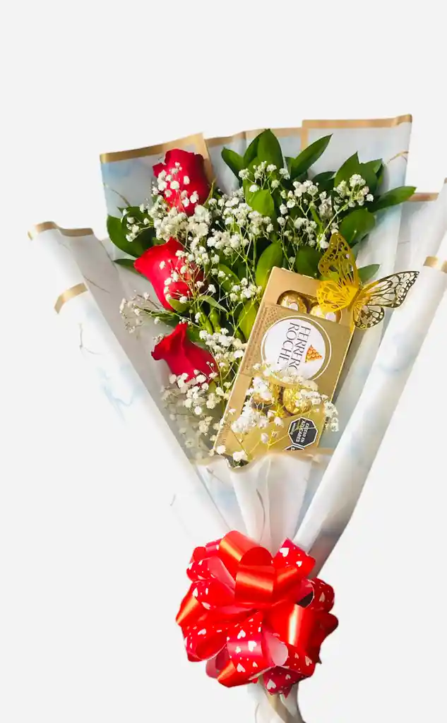 CONTIENE 3 rosas rojas, follaje , chocolates ferrero x8 y tarjeta personalizada ETIQUETAS DE BUSQUEDA Regalo para mujer Regalo para mi novia regalo de cumpleaños Arreglo floral para mi novia Arreglo floral para mi esposa ramo de flores Bouquet de flores Rosas chocolates