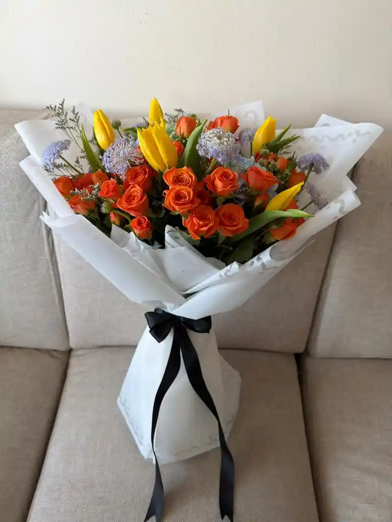🧡 Bouquet Naranjado Un estallido de luz para celebrar la vida. Celebra la vida y alegra el día con nuestro vibrante Bouquet Naranjado, una combinación espectacular que fusiona tonos cálidos y llenos de vida. Este arreglo incluye 5 tulipanes naranjas intensos, acompañados por flores en diversos tonos naranjados y melón, complemento perfecto para transmitir calidez, energía y alegría Composición del bouquet: Tulipanes naranjas frescos y elegantes. Mini rosas en tonos melón y naranja. Flores de textura única como copo de nieve, hortensias y calistemonas, que aportan volumen y movimiento al arreglo. Incluye: Tarjeta de dedicatoria personalizada para que puedas expresar tus sentimientos. Envoltura cuidada, perfecta para regalo. 🌱 Imagen referencial: Utilizamos flores naturales morfológicamente únicas. 📍 Disponible para entrega en Bogotá, La Campiña. 💳 Métodos de pago: Tarjeta de crédito, débito o transferencia bancaria inmediata, PSE.