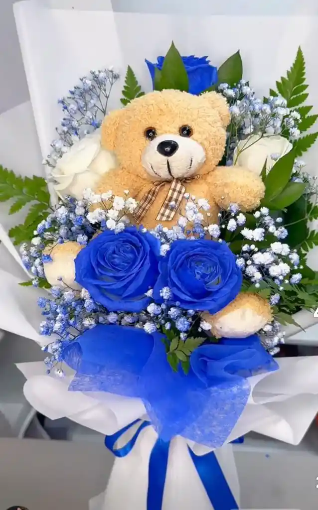 contiene 2 rosas, Blancas 3 rosas azules Un mini peluche follaje decoración tarjeta personalizada ramo de rosas azules ramo de rosas con peluche arreglo floral