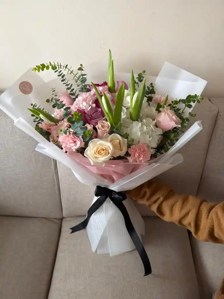💐 Bouquet Rosa Pastel Una mezcla que florece con calma y ternura. Este diseño suave y armónico reúne rosas rosadas , mini rosas, claveles, acompañados por hortensias y follajes como silver dólar y flor de temporada. Cada flor fue seleccionada para transmitir una sensación de dulzura, conexión y belleza serena, ideal para regalar en cumpleaños, agradecimientos o momentos especiales que merecen un detalle delicado.🌷 Algunas flores pueden variar según disponibilidad estacional. 🌱 Imagen referencial: Utilizamos flores naturales morfológicamente únicas.