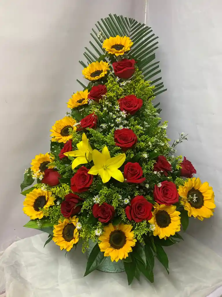 arreglo de girasoles rosas rojas lirio amarillo y tarjeta personalizada para toda ocasión