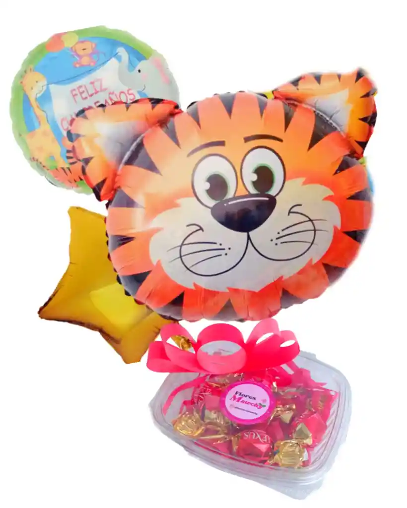 globos metalizados inflados con aire frio , acompañado de una caja de chocolates , y tu mensaje personal