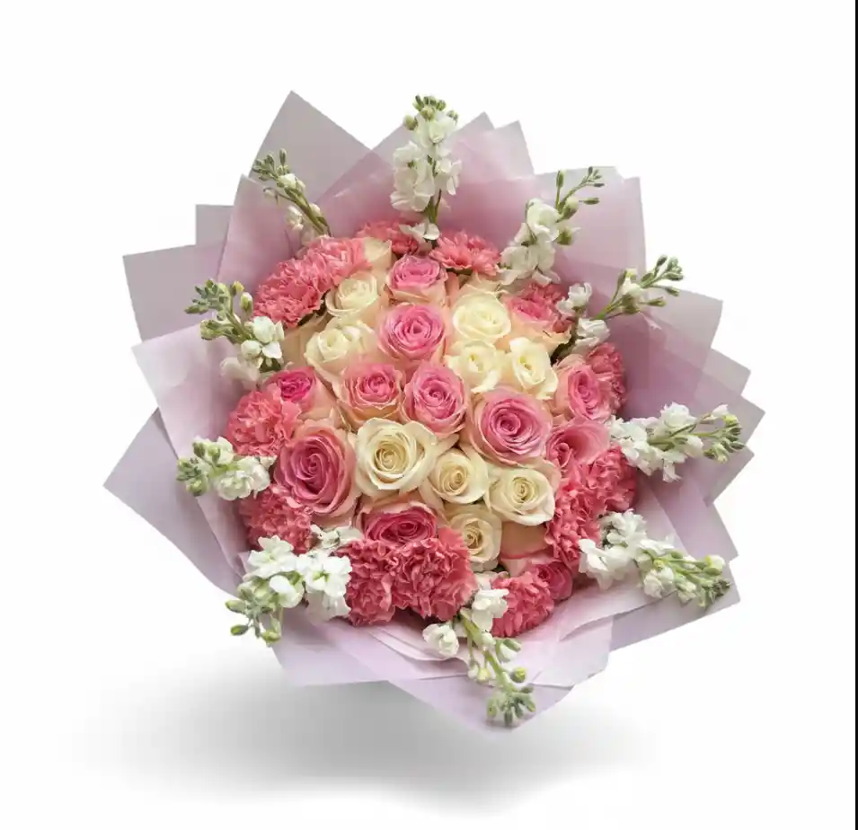 Elegante arreglo floral elaborado con rosas frescas en tonos rosados y crema, combinadas con delicadas flores blancas y claveles que aportan volumen y textura. Presentado en un envoltorio suave en tonos pastel, ideal para un regalo romántico y sofisticado.