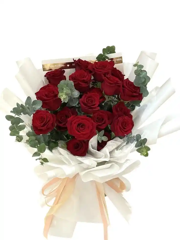 es una pieza sofisticada y moderna, ideal para quienes aprecian la belleza clásica con un toque contemporáneo. El arreglo destaca por sus intensas rosas rojas de tallo largo, seleccionadas por su frescura y color vibrante, armonizadas con ramas de eucalipto que aportan un aroma fresco y un contraste verde natural.