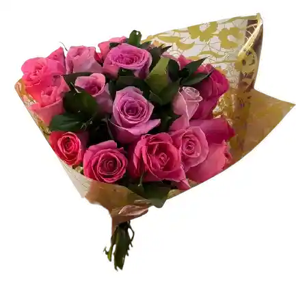 Ramo elegante con 12 rosas en degradé de rosados y fucsia, acompañadas de follaje verde y envueltas en papel translúcido con detalles dorados. Detalle romántico y delicado ideal para cumpleaños, aniversario o agradecimientos. Presentación premium con listón e incluye tarjeta dedicatoria. Entrega rápida el mismo día.