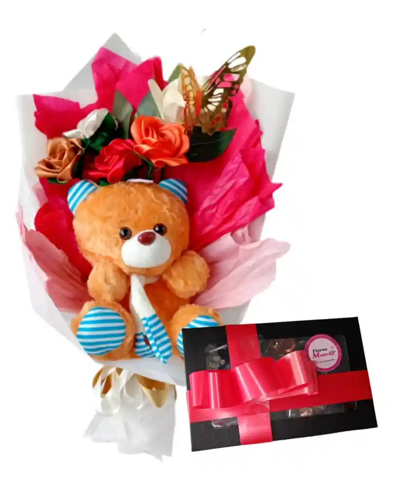 Sorprende a esa persona especial con nuestro Ramo con oso de peluche y flores, un detalle que combina la ternura de un osito adorable con la elegancia y belleza de flores seleccionadas cuidadosamente. Ideal para aniversarios, cumpleaños o cualquier ocasión para expresar amor y cariño con un toque dulce y elegante. Un regalo que alegrará el corazón y transmitirá emociones en cada abrazo y pétalo.
