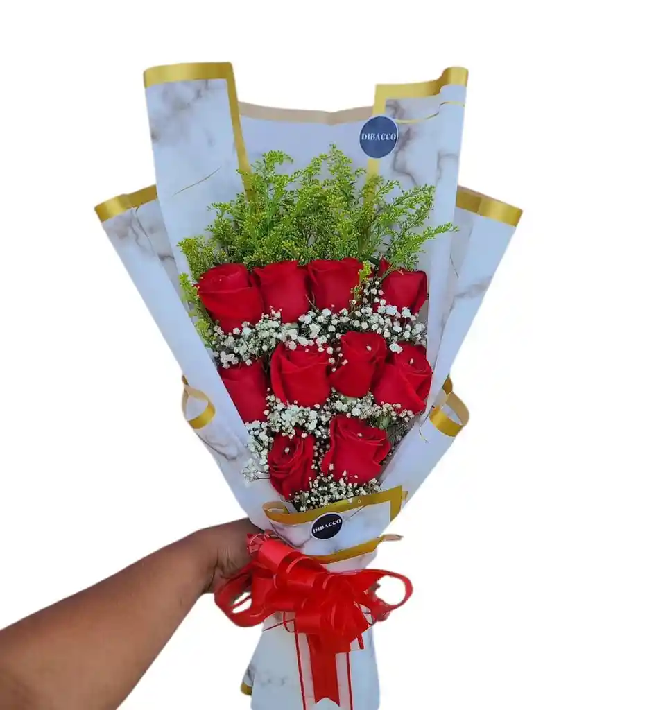 Contiene  10 rosas rojas  Follaje verde  Follaje blanco Decoracion Ramo de san Valentín  San Valentín Ramo para mujer Arreglo floral? Arreglo de cumpleaños Ramo para feliz día