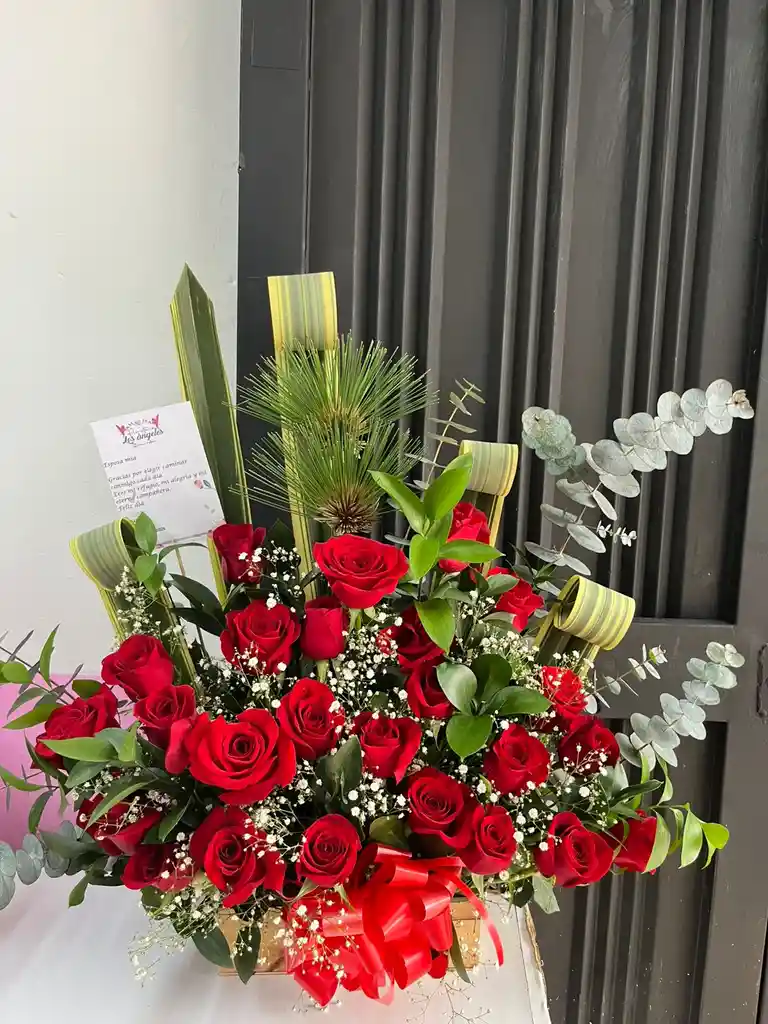RAMO DE ROSAS ROJAS EN BASE CON FOLLAJE Y DECORACIN , MENSAJE PERSONALIZADO
