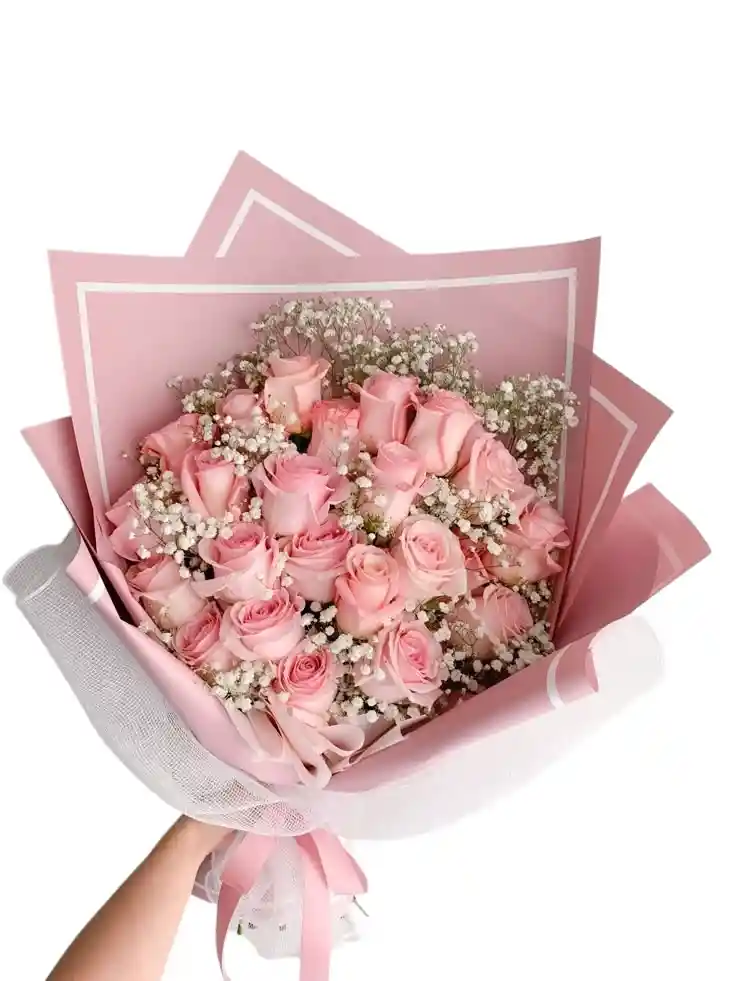 Celebra la dulzura y el romanticismo con este clásico ramo de rosas premium en un delicado tono rosa pastel, armoniosamente combinado con nubes de Baby's Breath (gypsophila) que aportan volumen y un toque etéreo. Esta composición atemporal está envuelta en papel coreano de alta calidad en tonos rosados con bordes definidos y rematada con un elegante listón de seda, creando una presentación impecable.