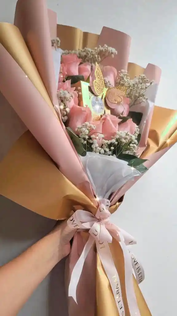 Ramo de rosas rosadas naturales con chocolates Ferrero Rocher, ideal para un regalo tierno, femenino y especial.