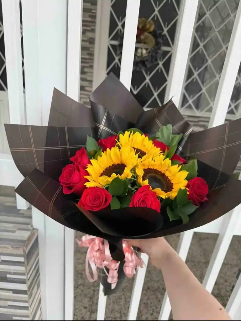 IMAGEN GUIA: Ramo de 3 Girasoles y 9 Rosas Frescas ( Color de rosa empaque y follaje puede variar según disponibilidad) Descubre la perfecta combinación de alegría y romanticismo con nuestro hermoso ramo de 3 girasoles y 9 rosas. Este bouquet, lleno de color y emociones, es ideal para expresar amor, amistad o gratitud en cualquier ocasión.