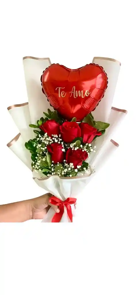 contiene 5 rosas rojas globo rojo follaje verde tarjeta personalizada