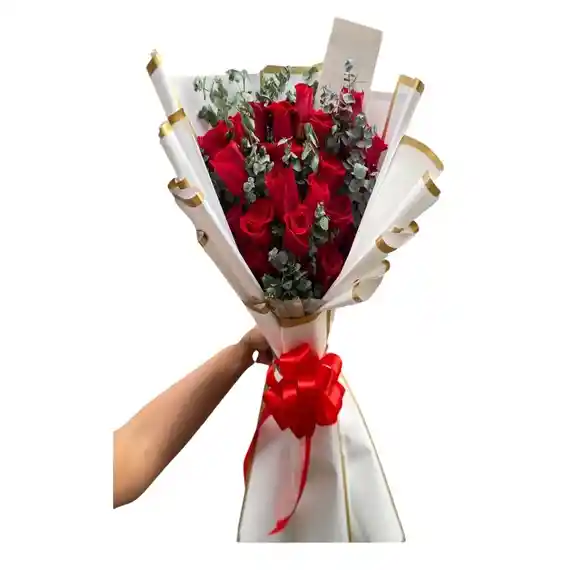 RAMO DE 18 ROSAS, EUCALIPTUS, DECORADO EN PAPEL COREANO BLANCO, MOÑO EN CINTA.