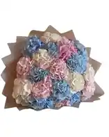 Bouquet de aprox. 6 hortencias azules , 6 hortencias blancas y 6 hortencias rosadas. Nota: La flor puede ser sustituida dependiendo la disponibilidad de color y del producto “Mensaje Personalizado” máximo de 30 caracteres (Dejar el mensaje en el chat, los comentarios no se previsualizan para la tienda por lo que si se dejan allí no podrá ser incluido).