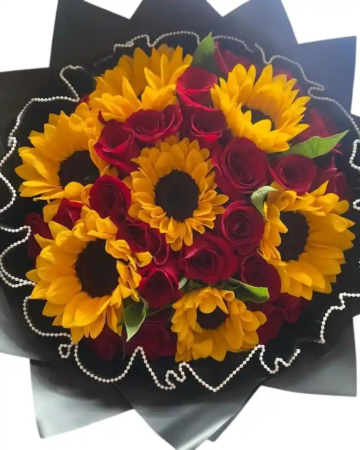 es una obra de arte floral diseñada para quienes buscan un impacto visual profundo y sofisticado. El arreglo destaca por un contraste audaz entre la energía de grandes girasoles radiantes y la elegancia clásica de rosas rojas premium, creando una composición que simboliza una admiración apasionada.