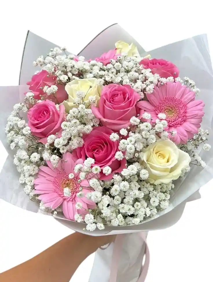 es una propuesta delicada y luminosa, diseñada para transmitir ternura y alegría en cualquier ocasión especial. El arreglo destaca por una armoniosa combinación de rosas en tono rosa vibrante y rosas blancas, acompañadas por la frescura de las gerberas rosas que aportan un aire jovial y moderno.