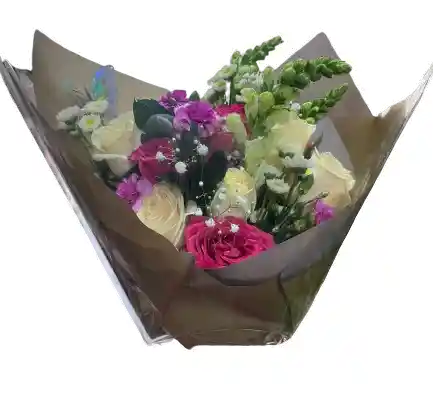 Bouquet elegante con rosas crema y fucsia, claveles morados, flores blancas y follaje fresco. Un detalle delicado y sofisticado para aniversarios, cumpleaños o agradecimientos. Presentación premium con envoltura moderna e incluye tarjeta dedicatoria. Entrega rápida el mismo día.
