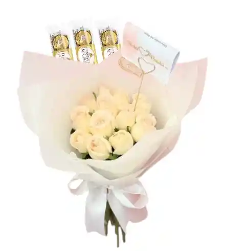 Bouquet redondo de 12 rosas blancas acompañadas de follaje, decoradas con papel, moño y 9 ferrero