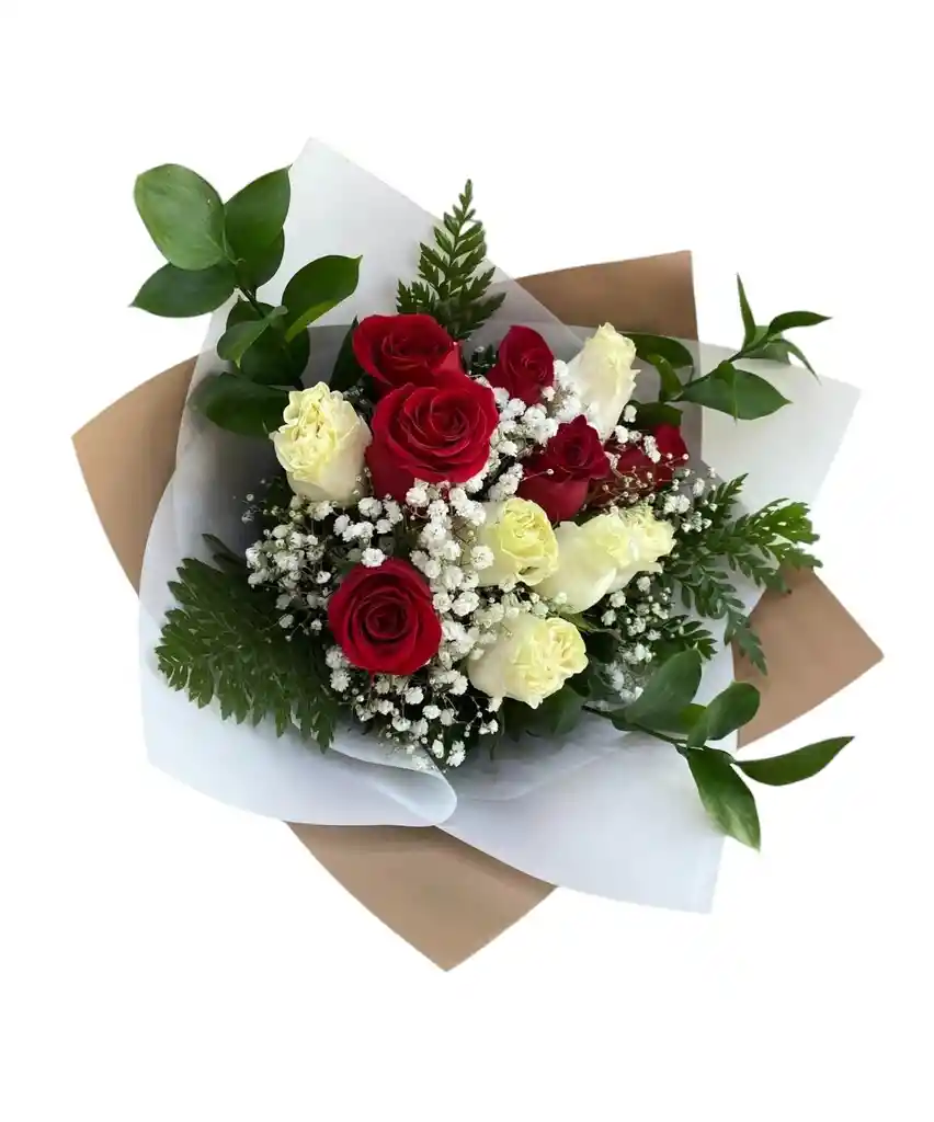Bouquet redondo de 18 rosas rojas y blancas acompañadas de follaje, decoradas con papel y moño