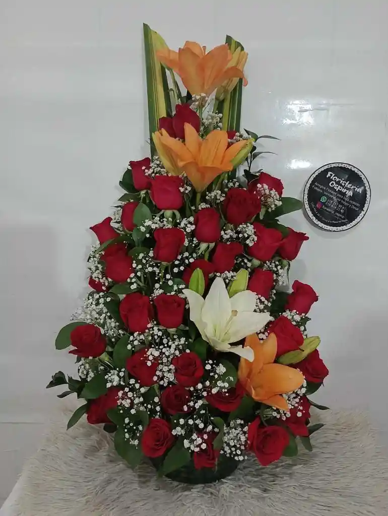 Ramo elaborado en rosas rojas y lirios naranjas y blancos, follaje verde, elaborado en una base de cristal. acompáñalo con globos, chocolates, peluches de nuestra tienda. deja tu mensaje en los cometarios para elaborar tu tarjeta.
