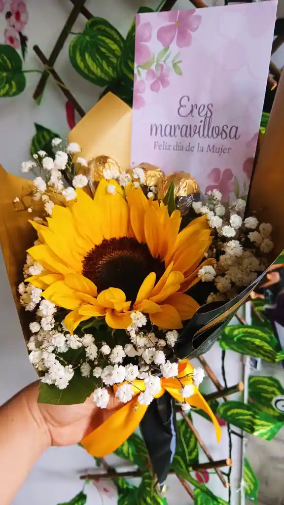 Ramo con girasol, 3 chocolates Ferrero Rocher, perla, empaque con moño y tarjeta personalizada.