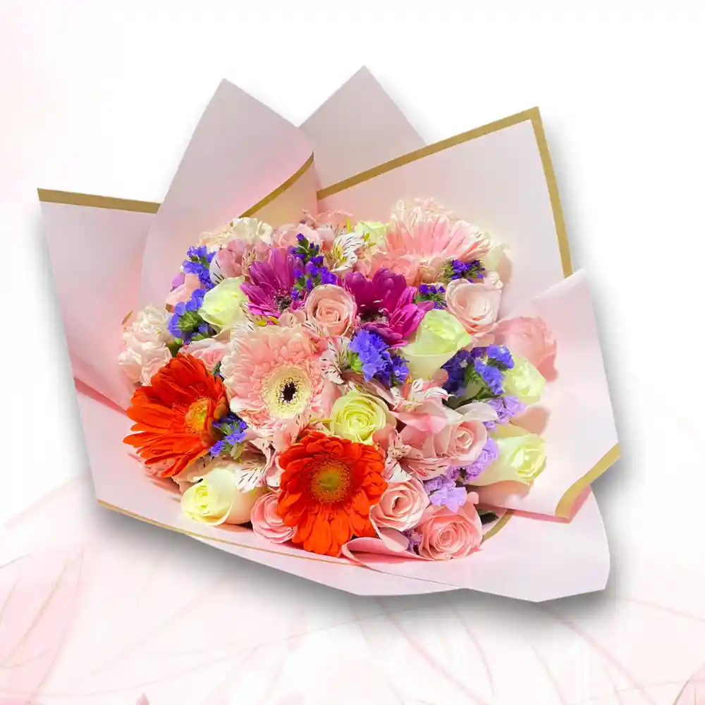 Ramo surtido de flores frescas en tonos pastel y vibrantes, elaborado con gerberas, rosas y flores de temporada, acompañado de follaje natural y envoltura elegante. Perfecto para cumpleaños, agradecimientos o sorprender con un detalle lleno de color y vida.