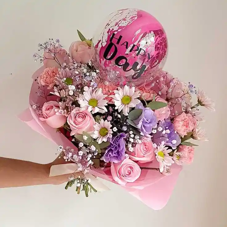 BOUQUET SURTIDO FLORES DE TEMPORADA PAPEL ROSADO O AZUL PASTEL
