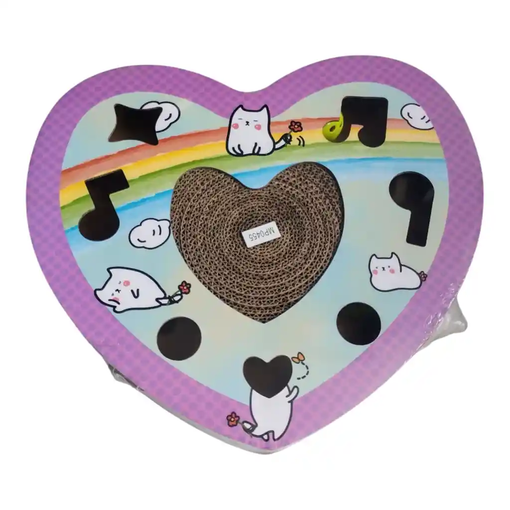 *Juguete para moler patas de gato de papel corrugado. *Especialmente diseñado para jugar, reduciendo en gran medida la soledad del gato cuando no está en casa. Almohadilla de texturas scch. *Esta tabla para gatos puede ayudar a su gato a mantenerse en forma y activo tanto mental como físicamente. *Un juguete para gatos imprescindible para mantener a tu  peludo alejado del sofá, la alfombra y otros muebles. Características *Diseño 2 en 1: El tablero rascador para gatos también está construido con un diseño divertido de pista de bolas de campana con multiples figuras, interactivo y multifuncional. *Alta calidad: El tablero rascador para gatos está fabricado con material de papel, resistente a los arañazos, al desgaste y duradero. *Auto diversión: Este rascador da diversión para gatos es fácil de atraer la atención de los gatos para jugar y moler . *Protección de muebles: El tablero rascador para gatos puede liberar fácilmente los instintos de rascado de los gatos, protegiendo los muebles del hogar. *Amplia aplicación: la almohadilla para rascar para gatos con bola de campana interactiva es adecuada para todas las edades de gatos de interior, gatitos, etc. Especificación *Material: papel Tamaño *Corazón: 33 cm x5.5 cm x 40 cm. El paquete incluye *1 pista de tabla rascadora.