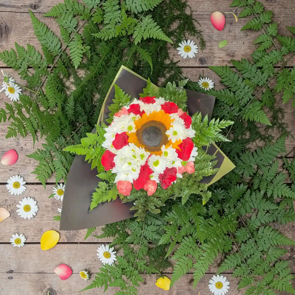 🌹🌻🌹🌻Celebra la vida con una explosión de texturas y colores vibrantes. En Loren's Floristería, hemos diseñado este bouquet compacto y lleno de energía, donde el sol se convierte en el protagonista absoluto de una danza floral. Este diseño se organiza en capas concéntricas para un impacto visual armonioso: Punto Focal Radiante: Un majestuoso Girasol en el centro, capturando toda la luz y simbolizando la felicidad. Anillo de Dulzura: Una combinación delicada de Rosas Rojas y Claveles Rosados que aportan profundidad, pasión y una textura aterciopelada única. Detalles de Pureza: Rodeado por alegres Margaritas Blancas que iluminan el diseño y le dan un toque silvestre y fresco. Follaje de Contraste: Finalizado con un marco de Helecho Cuero, cuyas hojas aportan un verde intenso y una estructura orgánica que realza los colores de las flores. Presentación de Vanguardia: Sellado con nuestro exclusivo Papel Coreano, que le otorga un acabado profesional, elegante y moderno, perfecto para cualquier ocasión. Es el regalo ideal para desear un feliz día, celebrar una amistad verdadera o simplemente para llevar un pedacito de jardín a las manos de alguien especial.