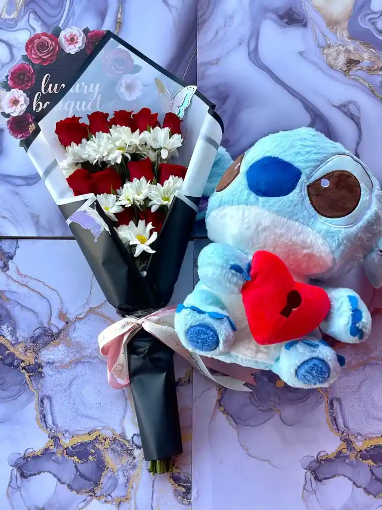 Bouquet de rosas rojas acompañado de delicadas flores blancas, envuelto en elegante papel negro con detalles modernos, mariposas decorativas y lazo rosado. Un arreglo sofisticado y romántico, perfecto para sorprender y expresar amor en cualquier ocasión especial. el peluche tienen un tamaño de 55cm alto x35cm de ancho Las cobijas tienen 180cm de largo x 1,10cm de anch